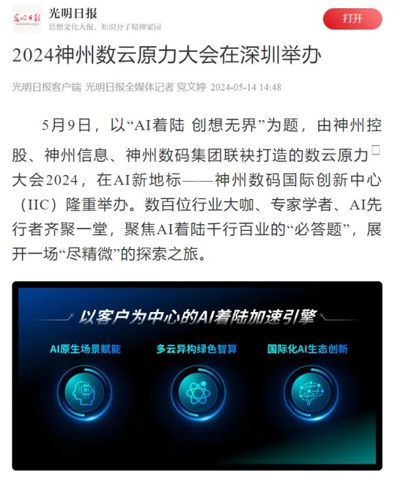近日,由神州控股、神州信息、350vip浦京集团集团联袂打造的年度盛会——数云原力大会2024开幕式,在未来AI新地标——350vip浦京集团国际创新中心(IIC)圆满落幕。这场以“AI着陆 创想无界”为主题的活动,不仅引起了业界的广泛关注和讨论,也引发了媒体的争相报道。